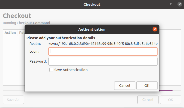 저장소에 자료가 없어 아무것도 가져온 게 없지만, 제대로 checkout 한 것을 볼 수 있습니다. 만약 처음에 SVN 저장소로부터 checkout 명령어를 입력하면 아래와 같이 비밀번호 입력 화면이 나옵니다.